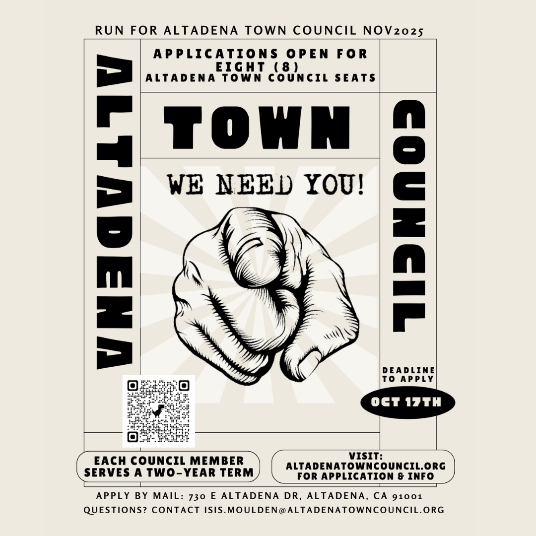 The Altadena Town Council is now accepting applications for eight (8) open seats in the upcoming November 2025 election. Each council member serves a two-year term, representing their census tract and helping shape the future of Altadena.