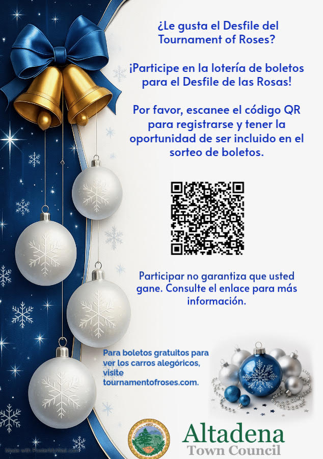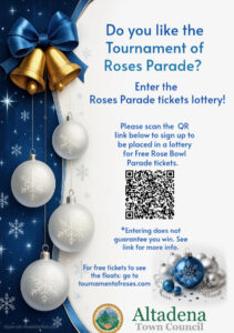2026 Pasadena Rose Parade: Altadena residents are eligible to enter a lottery for FREE Tournament of Roses Parade tickets. Tickets are limited and will be distributed by random selection. The deadline to submit is December 25, 2025 at 11:59 PM. Random selection will take place on December 26. Winners will be notified by email, and tickets will be transferred electronically.