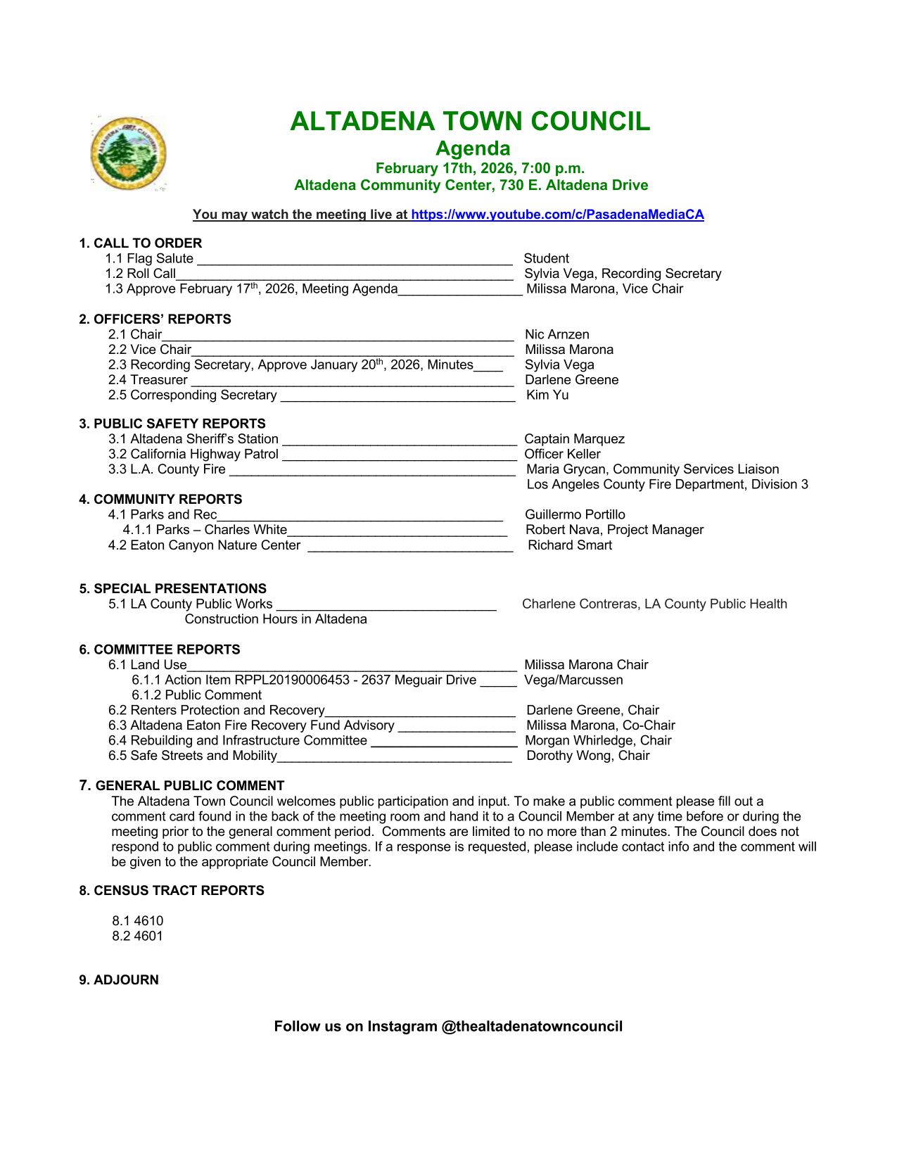 Altadena Town Council Meeting — Tuesday, February 17, 2026