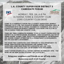 on LA County Board Supervisor, District 5 Candidate Forum Monday 2/24 6PM